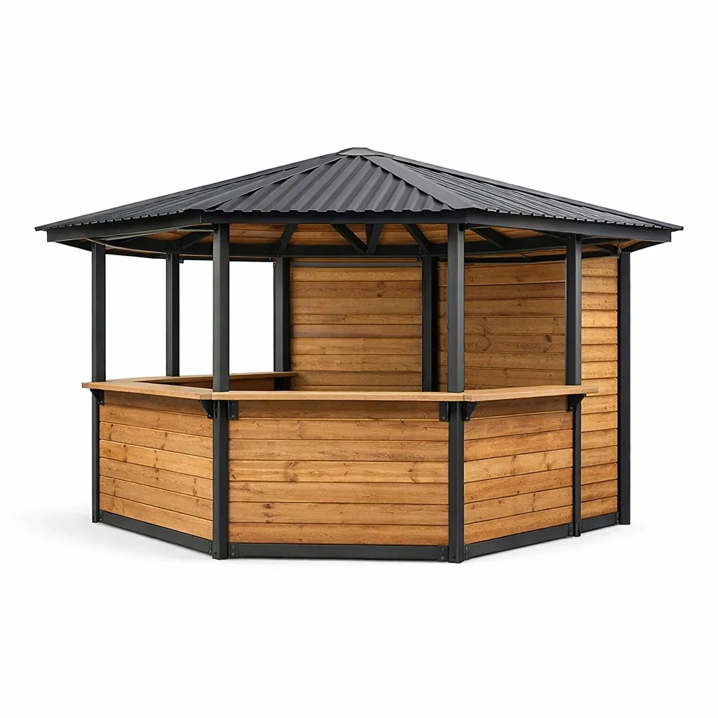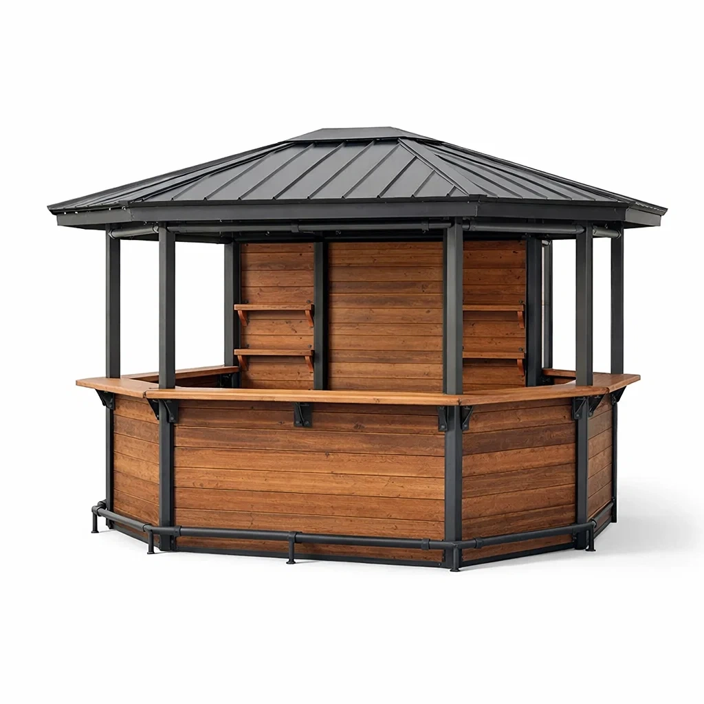 Kiosque bar de jardin octogonal en bois et métal avec toit en acier