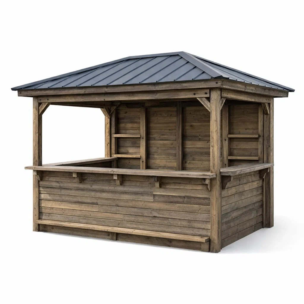 Ce kiosque de jardin est fabriqué en bois traité pour une durabilité accrue, complété par un toit en métal résistant aux intempéries.