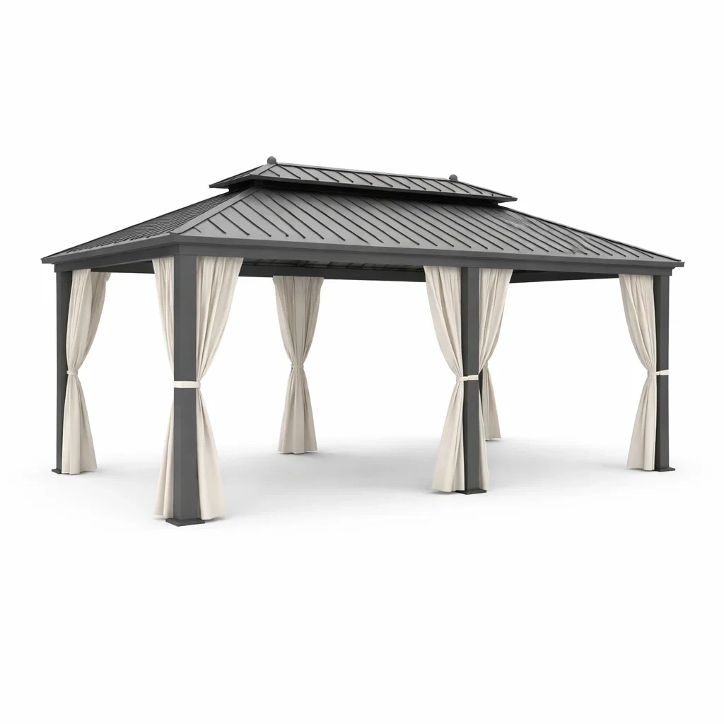Ce pavillon est construit avec des matériaux de haute qualité pour assurer durabilité et fonctionnalité. La structure est en aluminium, et le toit est fait d'acier galvanisé pour offrir une protection solide. Les rideaux sont en polyester, assurant une intimité nécessaire.