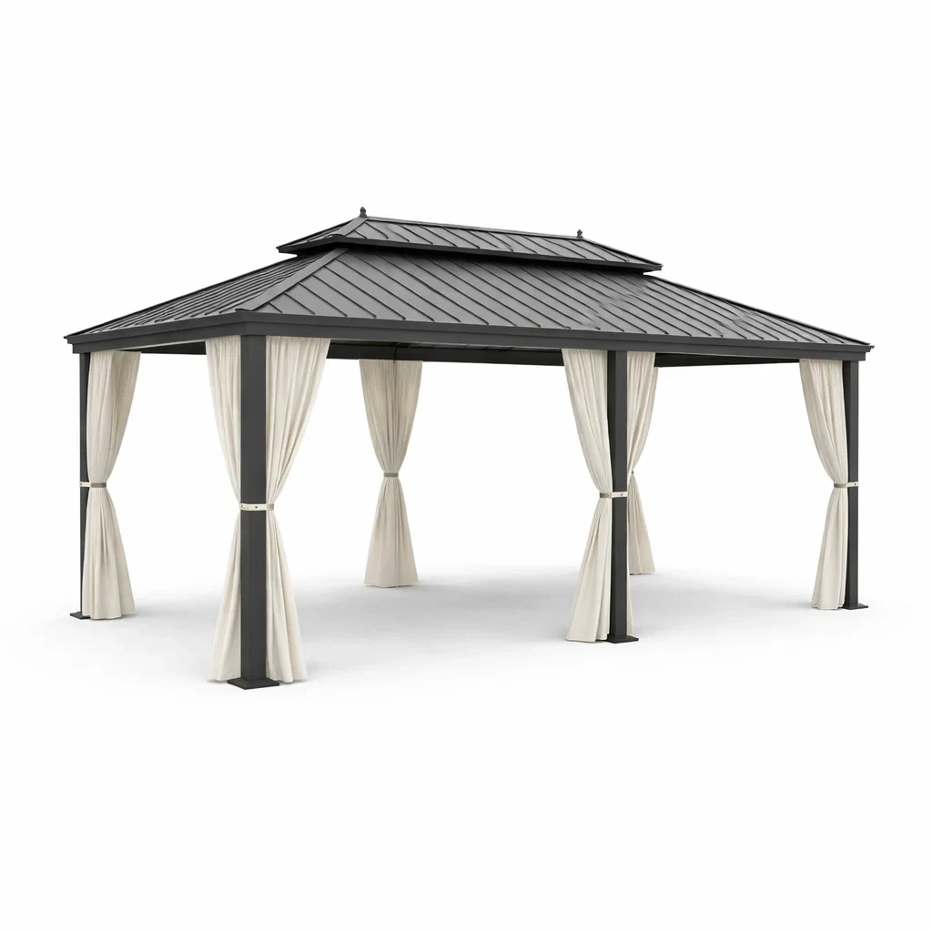 Le pavillon est conçu pour une utilisation en extérieur. Il est résistant à l'eau, à la corrosion et aux UV, mais ne doit pas être utilisé sous des vents forts. La stabilité est renforcée par un cadre solide et quatre supports.